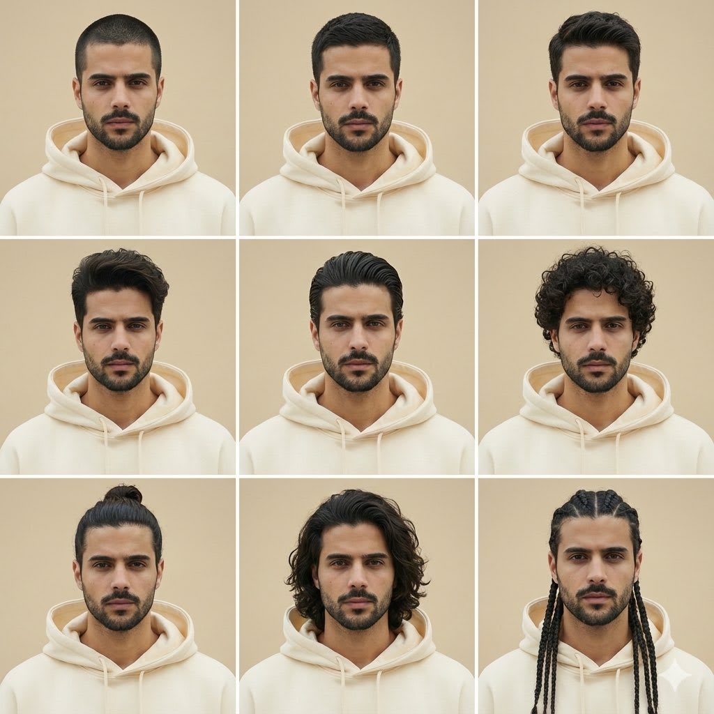 "description": "A clean, aesthetic 3x3 collage portrait showcasing different men's hairstyles. The same young man is captured in each frame, positioned in consistent lighting and pose, creating a style comparison grid.",