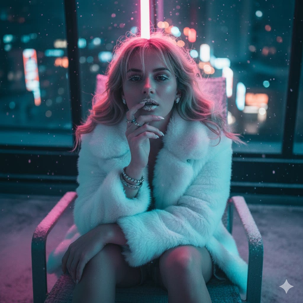 "{"image_description":{"upper_third":{"focus":"Her eyes","details":["Reflecting blurred city lights below","Thin layer of frost touching her lashes","Wind pushing a few strands of hair across her forehead"],"vibe":"Sharp retro-Y2K"},"middle_third":{"focus":"Her body and immediate surroundings","details":["Lying on a rooftop lounge chair dusted with snow","Wrapped in a white faux-fur jacket over a sequined winter dress","Soft neon glow bouncing off snowflakes on her sleeves"]},"lower_third":{"focus":"Close-up of her face and hands","details":["Facing the camera with one hand above her eyes","Shielding a bright pinkish neon light","Snowflakes clinging to her jewelry","Tiny drops forming near her lips"]}}}"