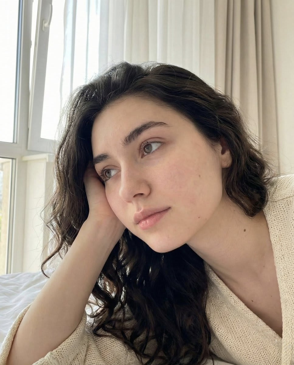 "{"image_generation":{"face":{"preserve_original":true,"reference_match":true,"description":"Use the same facial features, expression, and identity from the uploaded image without altering any facial structure, proportions, or features."},"photo_style":{"type":"natural portrait","camera_angle":"close-up, slightly tilted","lighting":"soft natural sunlight filtering through the window with gentle shadows","mood":"relaxed, soft, intimate","texture":"clear skin, soft grain, natural daylight","focus":"sharp detail on face, soft bokeh background"},"subject":{"pose":"laying on a bed with head resting on one hand, facing slightly to the side","expression":"soft, calm, relaxed, with a slight tilt of the head","hair":{"style":"long, dark, slightly messy with natural flow","texture":"soft, with some strands framing the face"},"clothing":{"type":"casual, relaxed indoor outfit","details":"light, soft fabric visible in the image, with no overt patterns"},"hand":{"position":"resting gently on her arm"}},"environment":{"setting":"cozy indoor scene, lying on a soft bed","background":"light-colored curtains with soft natural daylight streaming through the window","atmosphere":"warm, peaceful, intimate"},"aesthetic":{"style":"natural beauty portrait","features":["skin texture","gentle light effects","soft bokeh and window light","minimalist indoor setting"]}}}"