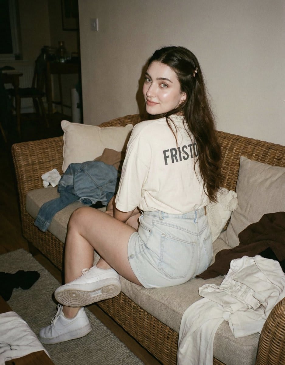 "{"image_generation":{"identity":{"preserve_original":true,"reference_match":true,"description":"Facial features must remain exactly identical to the provided reference photo."},"photo_style":{"type":"hyperrealistic lifestyle photo","camera_vibe":"Olympus MJU II aesthetic","lighting":"warm dim indoor lighting OR 35mm film-style flash","tone":"warm vintage VSCO vibe","texture":"soft grain, subtle film rendering","framing":"wide shot showing interior room details"},"subject":{"pose":{"body":"sitting on a woven sofa with back turned to the viewer","legs":"folded comfortably","hands":"one hand resting on the sofa","head":"looking over shoulder at the camera","expression":"playful, soft, naturally charming"},"appearance":{"hair":{"length":"long","style":"loose with a side part","accessory":"simple small hair clip"},"makeup":{"style":"light Korean glass-skin makeup","details":{"skin":"glowy, dewy finish","lips":"soft pink","eyes":"minimal eyeshadow, natural lashes"}}},"clothing":{"top":{"type":"cream oversized vintage T-shirt","print":"bold graphic text 'FRISTO' on the back"},"bottom":{"type":"light high-waisted denim shorts"},"shoes":{"type":"white sneakers"}}},"environment":{"setting":"cozy messy room","elements":["woven sofa","white pillows","scattered clothes in the foreground","soft indoor clutter for authentic lifestyle atmosphere"],"lighting_effects":["warm dim glow","or direct compact film camera flash","soft warm shadows enhancing vintage mood"]},"aesthetic":{"style":"vintage lifestyle editorial","vibe":"warm, nostalgic, candid","features":["rich room detail","natural textures of fabric and skin","soft grain and warm tones"]}}}"