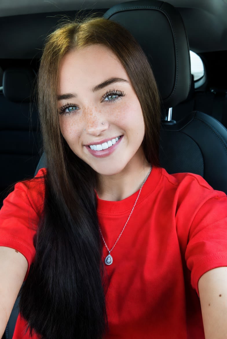 "{"meta":{"image_quality":"High","image_type":"Photo/Portrait/Selfie","resolution_estimation":"High resolution, sharp focus on subject"},"global_context":{"scene_description":"A close-up selfie portrait of a young woman smiling brightly, seated inside a vehicle. The setting is the front seat of a car, indicated by the black leather headrest and seat visible behind her. The lighting is soft and natural, suggesting daytime, likely entering through the car windows.","time_of_day":"Daytime","weather_atmosphere":"Bright, clear, cheerful","lighting":{"source":"Natural Daylight (Window)","direction":"Front/Side (Diffused)","quality":"Soft, even illumination","color_temp":"Neutral/Cool Daylight"}},"color_palette":{"dominant_hex_estimates":["#D92B2B","#1A1A1A","#EBC7B6","#4E3A2A","#F5F5F5"],"accent_colors":["Vivid Red","Deep Black","Silver (jewelry)","Dark Brown (hair)"],"contrast_level":"High (Bright red shirt against dark car interior)"},"composition":{"camera_angle":"Eye-level / Slightly high angle (Selfie perspective)","framing":"Close-up / Head and Torso","depth_of_field":"Moderate (Subject sharp, background slightly softened)","focal_point":"The subject's smile and eyes"},"objects":[{"id":"obj_001","label":"Young Woman","category":"Person","location":"Center","prominence":"Foreground","visual_attributes":{"color":"Fair skin with pink undertones","texture":"Smooth skin with natural freckles","material":"Biological","state":"Smiling, Happy","dimensions_relative":"Occupies 80% of the frame"},"micro_details":["Light freckles visible across nose and cheeks","Small nose stud on left nostril (viewer's right)","Well-defined eyelashes and groomed eyebrows","White, straight teeth displayed in smile","Two small moles visible on the right arm (viewer's left)"],"pose_or_orientation":"Seated, head tilted slightly to the right, facing camera","text_content":null},{"id":"obj_002","label":"T-Shirt","category":"Clothing","location":"Lower Center","prominence":"Foreground","visual_attributes":{"color":"Bright Vivid Red","texture":"Cotton jersey knit","material":"Cotton/Blend","state":"Clean, casual","dimensions_relative":"Covers torso"},"micro_details":["Ribbed crew neckline","Short sleeves with hem stitching visible","Slight fabric folds around the armpit/shoulder area","Hair resting over the fabric"],"pose_or_orientation":"Worn on body","text_content":null},{"id":"obj_003","label":"Hair","category":"Body Part","location":"Framing Face/Right Shoulder","prominence":"Foreground","visual_attributes":{"color":"Dark Brown / Chestnut","texture":"Straight, silky, long","material":"Hair","state":"Groomed","dimensions_relative":"Long, reaching past shoulders"},"micro_details":["Center part","Lighter brown highlights where light hits","Individual flyaway hairs visible at the crown against the dark seat","Bulk of hair draped over left shoulder (viewer's right)"],"pose_or_orientation":"Falling straight down","text_content":null},{"id":"obj_004","label":"Car Seat","category":"Furniture/Vehicle Part","location":"Background","prominence":"Background","visual_attributes":{"color":"Black","texture":"Leather/Synthetic, combination of smooth and perforated","material":"Leather/Vinyl","state":"Clean","dimensions_relative":"Fills background behind subject"},"micro_details":["Perforated texture visible on the center backrest panel","Smooth texture on side bolsters","Headrest visible behind subject's head","Stitching lines along the bolster seams"],"pose_or_orientation":"Upright","text_content":null},{"id":"obj_005","label":"Necklace","category":"Jewelry","location":"Neck","prominence":"Detail","visual_attributes":{"color":"Silver","texture":"Metallic","material":"Metal","state":"Intact","dimensions_relative":"Small, delicate"},"micro_details":["Thin chain link","Small pendant, possibly teardrop or oval shape with a stone","Resting centrally on the neck/collarbone area"],"pose_or_orientation":"Hanging around neck","text_content":null}],"text_ocr":{"present":false,"content":[]},"semantic_relationships":["Subject (obj_001) is wearing T-Shirt (obj_002) and Necklace (obj_005)","Subject (obj_001) is seated in Car Seat (obj_004)","Hair (obj_003) is obscuring part of the T-Shirt (obj_002) on the right side","Car Seat (obj_004) provides high contrast background for the Subject's face"]}"