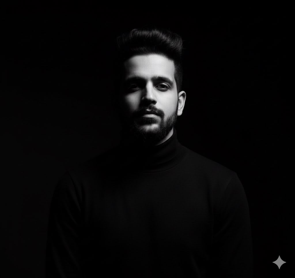 "A powerful, high-contrast black-and-white side-profile portrait of a person (attached photo), with distinctly human yet timeless features β emerging from complete darkness. The composition is minimalist and sculptural, where form, light, and shadow define the subject rather than color or texture.