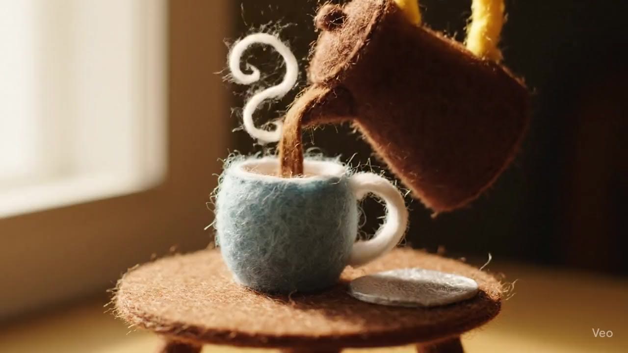 "After breakfast, a cute felt mug rests on the small felt dining table. A felt coffee pot tilts, pouring warm brown felt coffee smoothly into the mug. A soft “pouring” sound is heard as tiny felt steam puffs rise above the cup, swirling gently. Beside the mug, a small piece of felt toast and a shiny felt plate remain. A felt hand-shaped puppet lifts the mug slowly, bringing it closer as if savoring the aroma. Gentle morning sunlight filters through the window, completing the cozy moment.