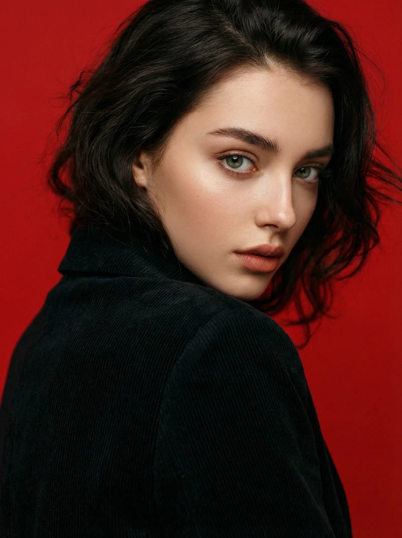 "A cinematic portrait, turning your head over your shoulder with an intense and mysterious gaze. The background is a striking solid red, creating a powerful editorial atmosphere. The image is tightly framed on the face and shoulder, emphasizing the gaze and the texture of the top of your outfit—a black corduroy blazer. The image was shot with a 85mm lens, with a shallow depth of field, high-contrast lighting, a bold fashion editorial style, ultra-detailed, and 4K resolution."