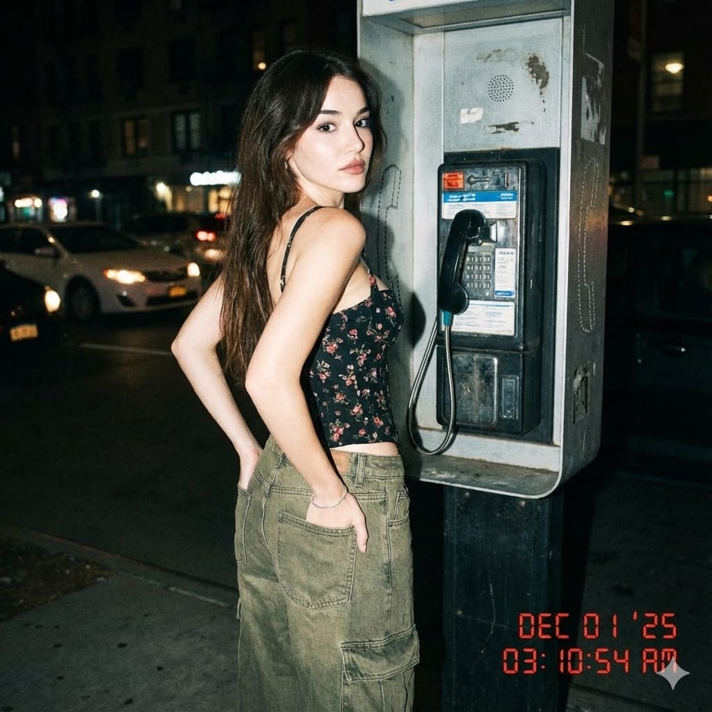 "Nighttime flash photo with Y2K aesthetic, red digital timestamp in corner. Young woman at a public payphone, face based on uploaded image, turning back toward camera with a detached look. Wearing corset top and loose cargo jeans, nands in back pockets. Strong flash contrast and blurred car lights in urban background, raw early-2000s paparazzi vibe."
