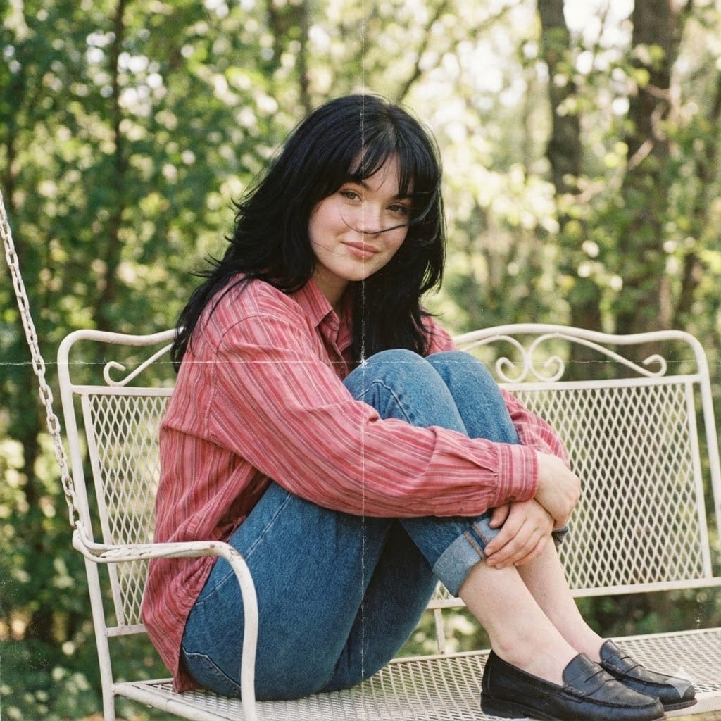 "Create this photo photorealistic with a strong nostalgic and melancholic atmosphere without altering the face in any way (maintain 100% likeness to the reference photo). The subject is a young woman sitting casually on a white iron swing chair typical of the 1980s. She is hugging her knees with her legs crossed, her head tilted slightly to the right, and she wears a soft, gentle smile. Her long black hair is styled in a 90s Soft Layered Retro Blowout: full volume, soft layers framing her face, naturally curved ends, and a thick, dense lower section. Her see-through bangs have softly widened tips with a slightly natural middle part (a strand of hair is blown by the wind, crossing her face) facing toward the left side (toward another partially visible subject). Her makeup looks light: defined eyebrows, soft red lipstick, and a subtle blush that adds a fresh look. She is wearing a medium-striped casual shirt in a soft-pink and red color combination—slightly thick and loose, giving a relaxed, ef"