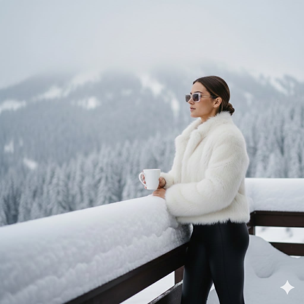 Background: snowy mountain terrace, heavy snow on railings, forest in background. Lighting: cold daylight softened by fog, natural reflections on glass. Camera: 50mm f/2.0, natural cinematic winter tone. Mood: luxury après-ski, calm sophistication. Format: