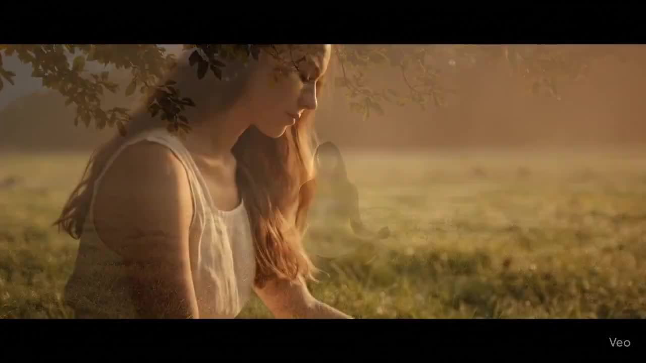 "early morning mist over a quiet field. The same woman, barefoot, sits cross-legged on dew-covered grass, eyes closed, breathing deeply. She opens her eyes slowly and begins to write in a journal by candlelight. Earthy color tones: soft browns, greens, and amber. Warm, diffused golden-hour light filters through nearby trees. Camera: slow dolly-in to close-up as she pens the line, “Am I content, or just content-creating?” Audio: ambient nature—birdsong, light breeze, the scratch of pen on paper. Faint analog crackle from a vintage record player in the background playing a mellow piano score. Style: grounded, meditative realism."