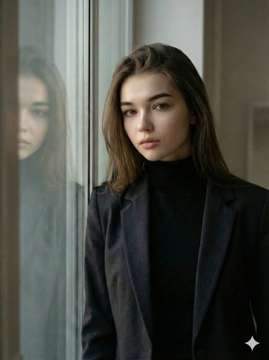 "prompt_description": "A striking portrait of a young woman standing indoors next to a large window, looking directly at the viewer. She is dressed in a sophisticated, dark outfit, featuring a black turtleneck sweater and a fitted charcoal gray or black blazer. The lighting is soft, likely natural light coming from the window, creating a gentle highlight on her face. A subtle reflection of her is visible in the window glass to the left, adding depth and composition interest. Her long, dark brown hair falls naturally around her shoulders. The background is minimalist and subdued, emphasizing the subject.",