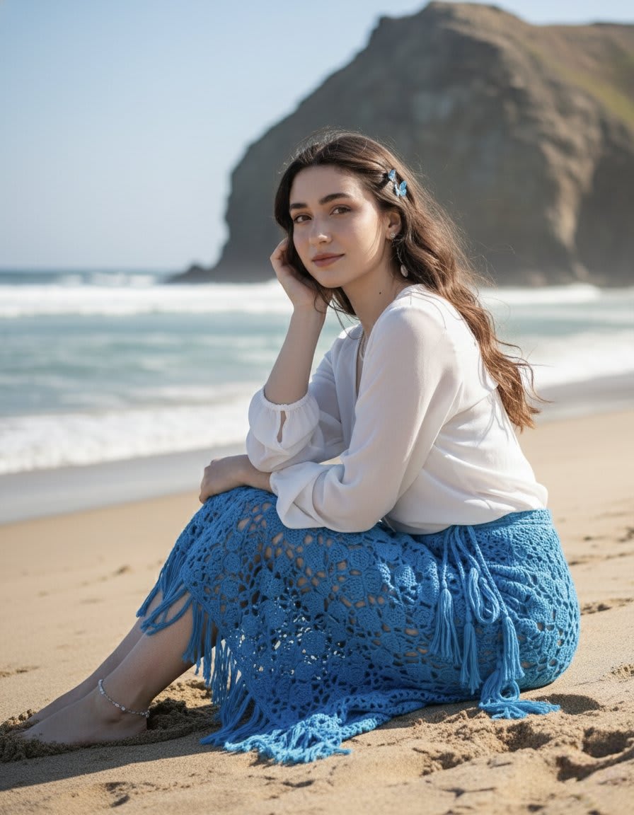 "bottom": "bright blue crochet wrap skirt with long tassel fringe",