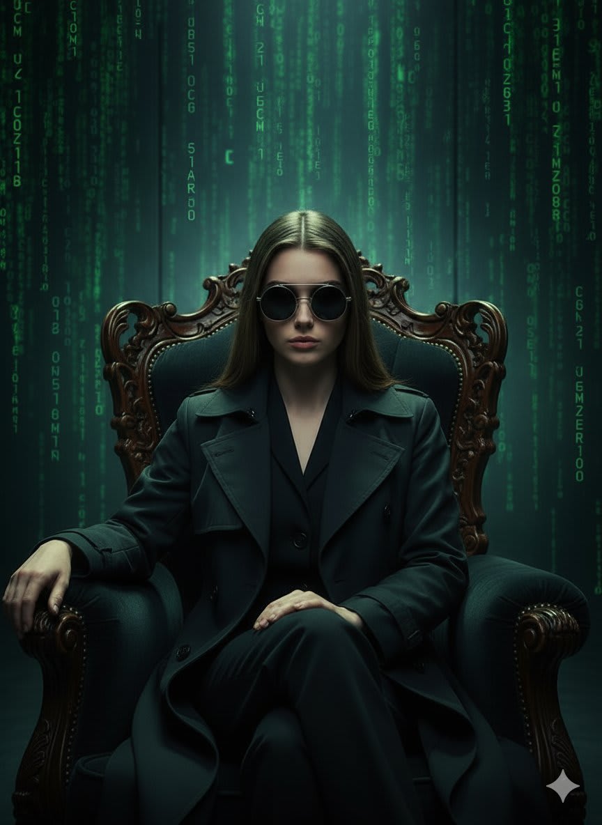 "A cinematic, hyper-realistic portrait of a woman (use the user's face) seated in a grand, ornate dark armchair. She wears a dark trench coat over a crisp suit, accessorized with distinctive round sunglasses, giving her an enigmatic and composed aura. Her posture is intentional and confident, with both hands extended forward, The background is a dark, almost sterile room illuminated by cascading green digital code, flowing down the walls or appearing projected, evoking a simulated reality. Dramatic lighting casts deep shadows, highlighting her expression and the gravity of the choice she presents. The overall mood is tense, mysterious, and cinematic, inspired by cyberpunk aesthetics."