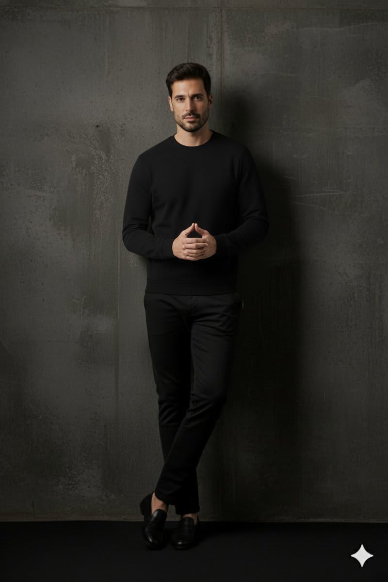 "outfit": "black sweatshirt and black trousers, casual yet stylish look",