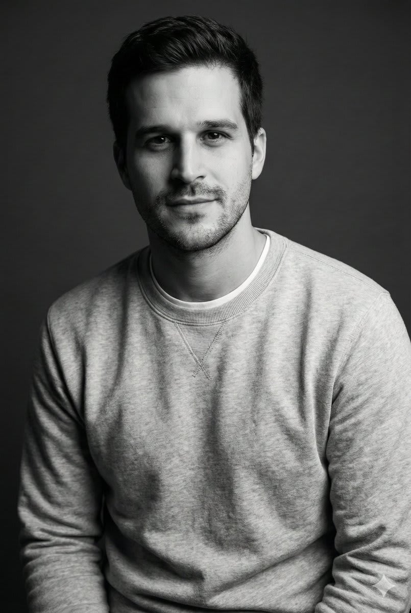 "subject": "Man identical to reference, captured in a monochrome studio portrait",