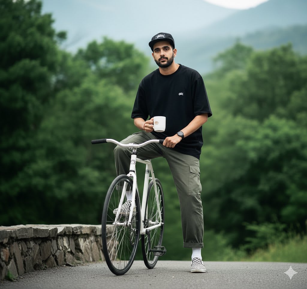 "Cinematic DSLR portrait in 16K hyperrealistic quality: A handsome, stylish young man striking a cool and fashionable pose (preserve 100% of his original facial features). He is wearing an oversized black t-shirt (see attached photo), wide/loose army green pants, black-and-white checkered Vans shoes, white socks, and a black “Stussy” 5-panel cap.