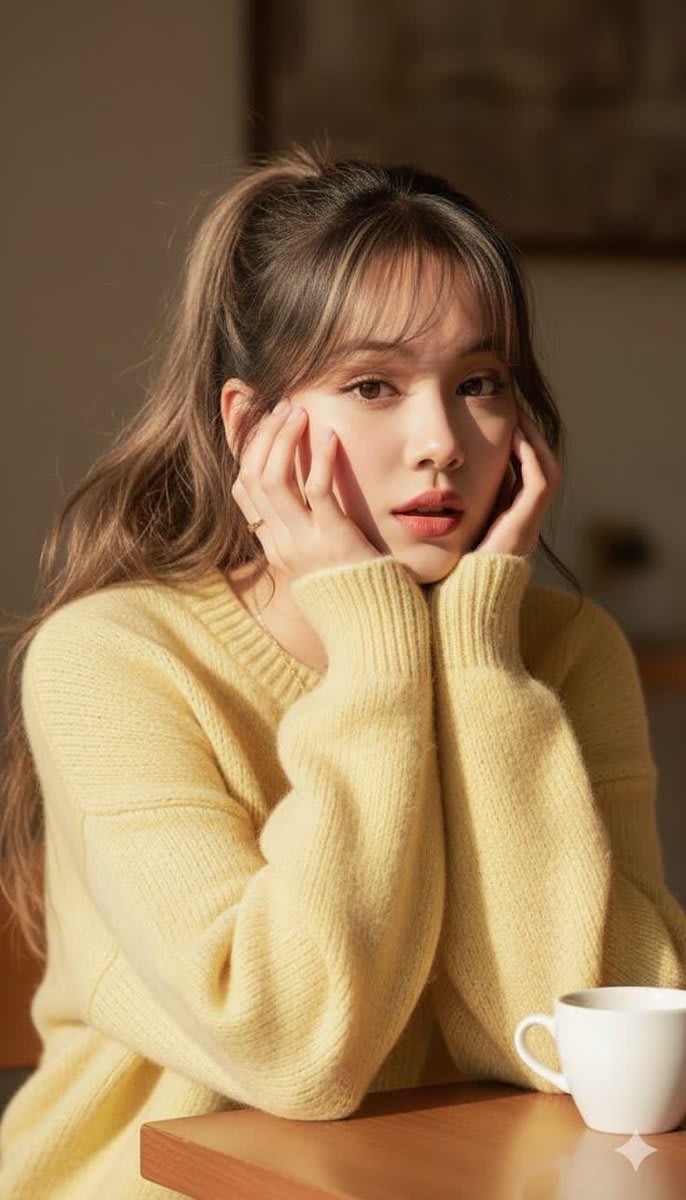 "A high-resolution photorealistic portrait of a young woman sitting at a wooden table in a sunlit cafe. She has long soft brown hair tied back in a high loose ponytail with wispy bangs framing her face. She is wearing a chunky oversized pastel yellow knit sweater.