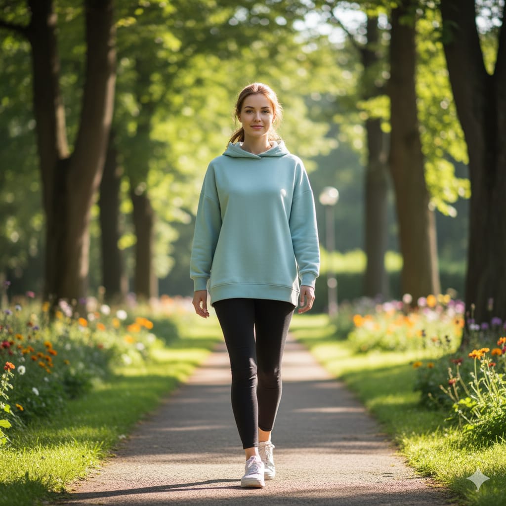 "A graceful young woman with a serene smile is walking confidently toward the camera along a sunlit park path. She wears a modest, loose-fitting pastel-colored hoodie paired with comfortable black leggings, perfect for exercise and movement. Her long hair is loosely tied back with a few strands softly framing her face, which radiates freshness and calm energy.