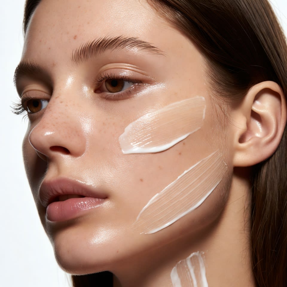 "a caucasian model's facewith bunette hair, showing cream on her cheek and neck in a vertical line. the background is white to highlight details, focusing attention on her facial features and skincare product application. The skin shows minor imperfections and pore but it still looks healthy"