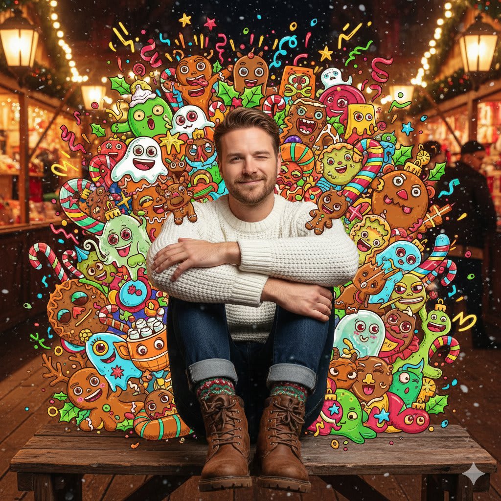"{"subject":{"type":"the person from the reference photo ONLY","identity_restriction":"Do NOT use any traits, gender, clothing or body features from previous prompts. Use ONLY the face, body type, and identity from the reference photo.","pose":"sitting on a wooden market bench with knees pulled up and arms wrapped around them, giving a cheerful wink","expression":"warm, festive, friendly"},"appearance":{"match_reference":"Facial structure, hairstyle, and overall appearance must EXACTLY match the reference photo","hair":"same hairstyle as reference photo","clothing":{"style":"winter outfit inspired by reference, adapted for Christmas market","top":"cozy winter jacket or sweater (match reference photo colors if possible)","bottom":"neutral comfortable pants or shorts depending on reference","socks":"winter socks","shoes":"winter boots"}},"environment":{"setting":"outdoor Christmas market","details":"twinkle lights, wooden stalls, warm hanging lanterns"},"lighting":{"type":"warm golden fairy-light glow","mood":"cozy, festive, romantic"},"camera":{"angle":"low-to-mid angle","lens_effect":"slight wide-angle with warm bloom","framing":"subject centered among Christmas lights"},"art_overlay":{"style":"maximalist Christmas sweets-monster pop-art","illustrated_elements":{"monsters":"gingerbread goblins, candy-cane worms, snowball blob creatures, hot-cocoa monsters with melting marshmallow faces, cookie reindeer, tiny ornament gremlins, eggnog ghosts, fruitcake beasts","graphic_shapes":"neon stars, snowflakes, sparkles, swirls, drips, zigzags, holly leaves, ribbon curls, comic bursts without text","style":"flat neon holiday palette (red, green, gold, icy blue, pink, lime) with thick black outlines"},"placement_and_density":{"behind_subject":"background filled with overlapping Christmas monsters and shapes","around_subject":"monsters peeking from behind shoulders, around boots, near hair, above the bench","over_clothing":"some gingerbread creatures cling to clothing","avoid_skin":"face and hands remain fully photorealistic","depth_layers":"heavy layering front and back for strong pop-art depth","energy_effects":"glowing rim lights, falling stylized snow, neon speed lines"}},"style":{"overall":"cozy Christmas market portrait overwhelmed by neon festive monsters","aesthetic":"warm, chaotic, holiday-playful, surreal"}}"