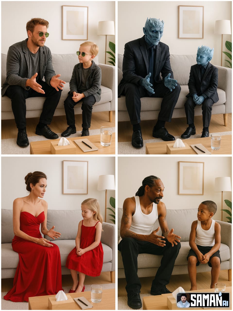 "Photorealistic minimalist therapy room; light walls, grey sofa, wooden coffee table with a tissue box, notebook and a glass of water, simple frame and floor lamp, soft natural daylight. The same person at two ages sits side-by-side: adult on the left speaking with open hands; child on the right listening with head slightly down. Both wear matching [OUTFIT] (same color & style). Clean studio vibe, centered composition, shallow depth of field, 50mm look, 4K, vertical 3:4. No extra people, no text, no watermark."