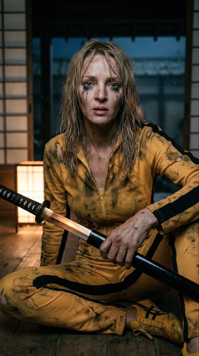 "Cinematic extreme close-up portrait (Uma Thurman, 36 years old), sitting motionless on the polished wooden floor of a silent, abandoned Japanese garden house at twilight, yellow Bruce Lee jumpsuit severely torn and frayed at shoulders, sleeves, chest and knees, fabric hanging loose and heavy with dried sweat, long blonde hair completely undone, damp and tangled, strands stuck to her pale forehead and cheeks, black eyeliner and mascara melted into long, dried black tear trails down her face, red-rimmed eyes wide open but dead, staring straight ahead into total nothingness, lips slightly parted, no breath visible, right hand resting limply on the scabbard of her legendary Hattori Hanzō katana lying across her lap, blade half-drawn and catching the last faint amber light filtering through paper screens, subtle dust motes floating in the air, single low paper lantern casting warm golden rim light that carves brutal shadows across her hollow expression, ultra-realistic, photorealistic, hyper-detailed skin pores, sweat-stained fabric texture, worn sword steel and wooden floor grain, subtle film grain, absolute silence after revenge, soul completely extinguished, masterpiece, best quality."