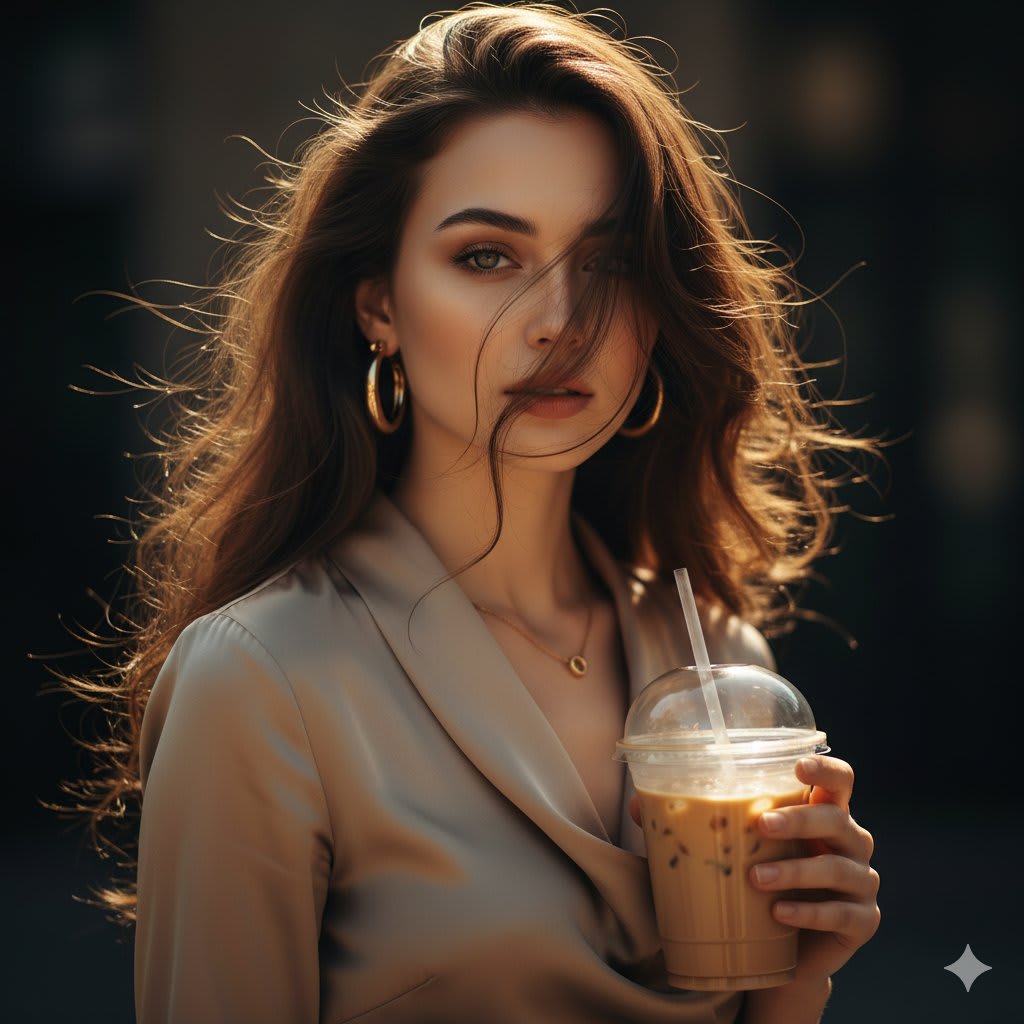 "Create an Elegant portrait of a young woman holding an iced coffee cup, standing under soft natural sunlight. She has long dark flowing hair, partially covering her face in the breeze, creating a cinematic and moody atmosphere. She wears a silky beige blouse with soft draping fabric, accessorized withbold golden hoop earrings and a matching gold necklace The background is blurred and dark, making the subject glow in warm light, giving a refined, artistic, and high-fashion editorialvibe."