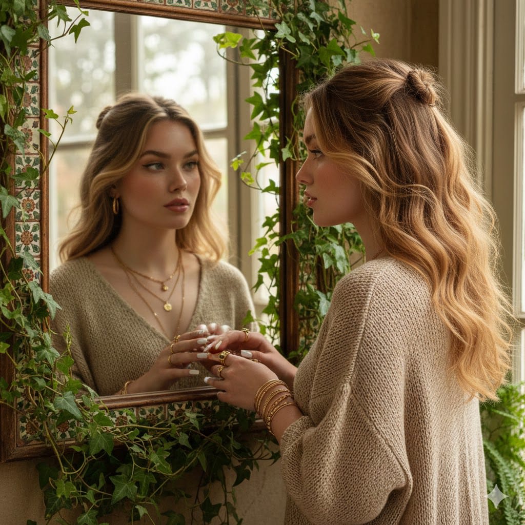 She is looking into a rustic, antique mirror framed with decorative tiles and surrounded by lush green foliage that grows around and over it, suggesting an indoor space with an outdoor feel or a sunroom. The background is gently blurred, emphasiz"