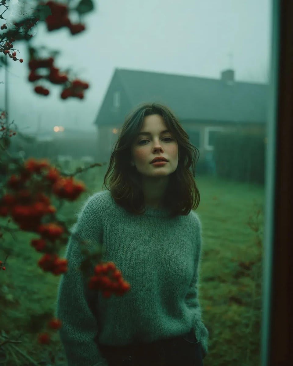 "Mdjourney cinematic realism, ai garden portrait, foggy atmosphere photography, soft glass reflections, shallow focus aesthetic, moss green tones, cinematic 50mm realism, misty morning light, emotional ai art, diffused daylight mood, rural scene aesthetic, muted color palette, ultra realistic ai image, cinematic composition, ai storytelling photography"