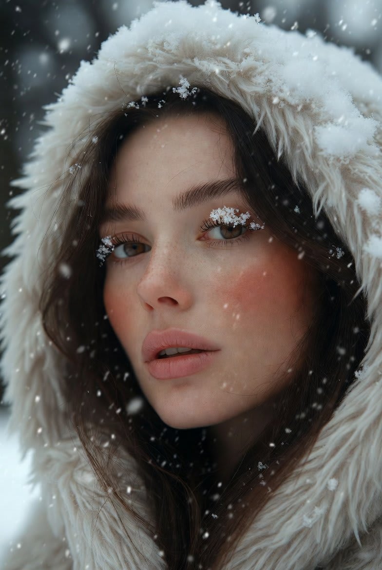 "A realistic photo in a snowy winter setting. A close-up of a woman's face from a reference photo, with the same facial features and expression, wearing a fluffy off-white teddy coat hood, snowflakes on her eyelashes and hair, soft blush on cheeks, and gentle natural light. Cinematic atmosphere, soft, dreamy, high-resolution, cool winter tones."